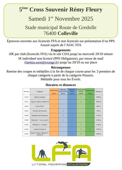– le samedi 1er novembre : cross de Colleville (76400, prĂŞt de FĂ©camp)