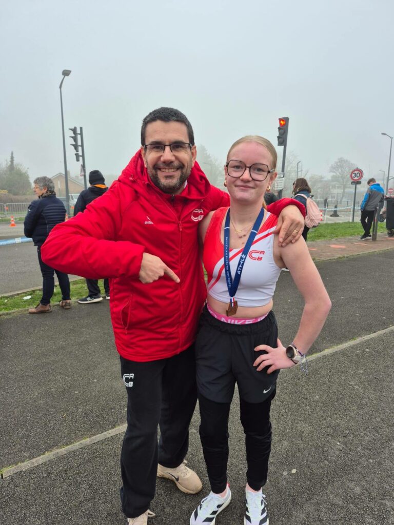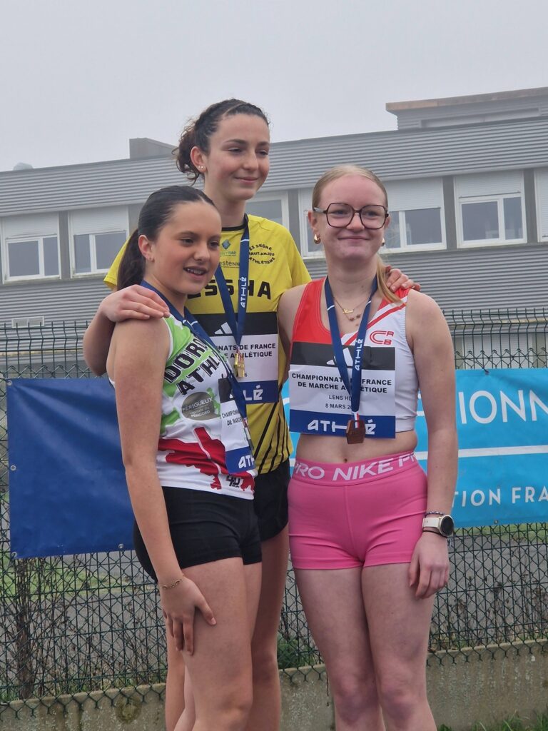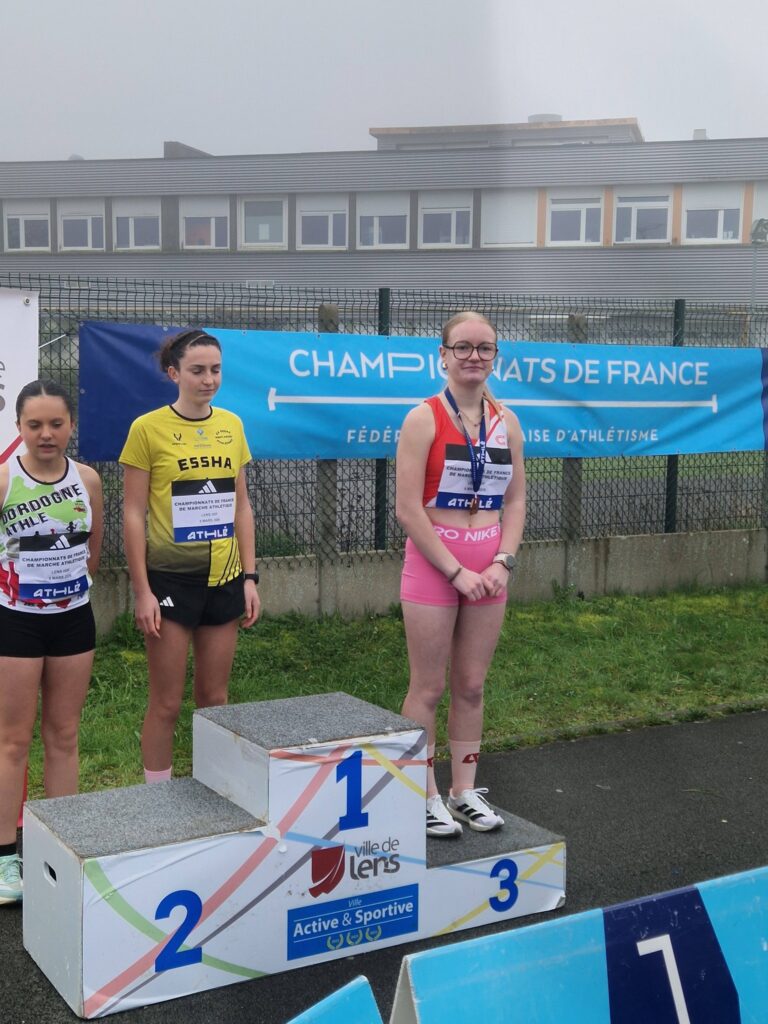 - A 8h40 avait lieu le 3km marche minimes avec Lena Racine. Elle a établi son nouveau Record Perso sur la distance en 15’21. 1er km en 5’03, 2ème km 5’14 et un dernier km en 5’04. C’est très fort. En + de ce record perso, elle obtient sa 2ème médaille nationale en prenant une belle 3ème place. 🥉