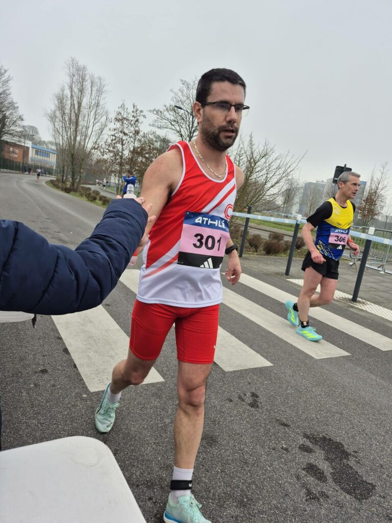 - Puis à 11h20, c’était mon heure pour mon 1er championnat de France sur semi marathon marche. L’objectif était de prendre le départ et de finir (en tout cas c’était le souhait de mes athlètes) merci à elles pour leurs encouragements à chaques tours. Malgré une fin de course compliquée, j’ai réussi à finir en 1h59″54.